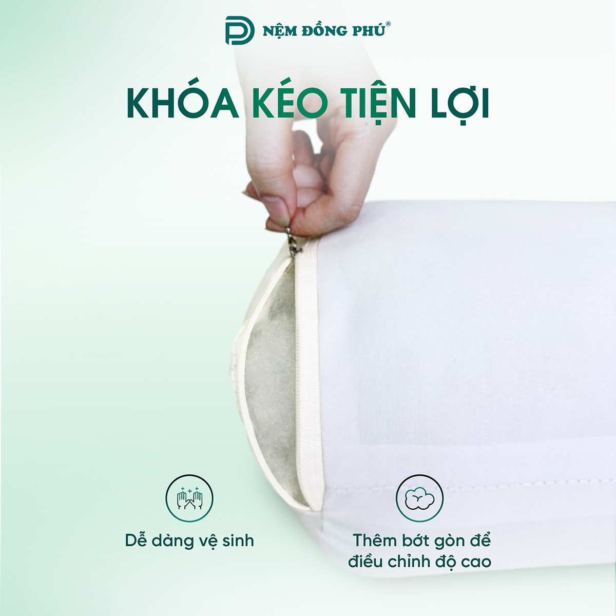 Một ưu điểm lớn của gối ôm gòn Đồng Phú chính là sự dễ dàng trong việc vệ sinh và bảo quản. Vỏ gối được trang bị khóa kéo tiện lợi, cho phép người dùng nhanh chóng tháo rời để giặt sạch khi cần, giúp tiết kiệm thời gian và công sức.